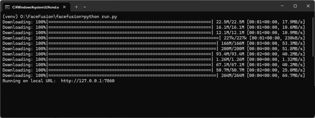 FaceFusionが問題なく起動されると、URLが表示されます。今回は http://127.0.0.1:7860 が表示されました。