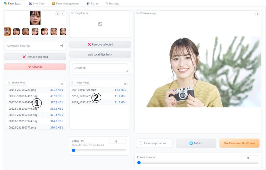 次に置き換え先の顔画像を⑤から選択し、置き換え元の顔画像(動画から抽出した画像)を⑥から選択します。