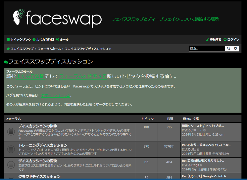 FaceSwap はインストーラーが用意されているため、事前の環境構築が必要なく簡単に始められます。また、2024年3月時点でも更新が行われており、マニュアルの充実度や活発なコニュニティーの存在など、他のFaceSwapには無い強みがあります。